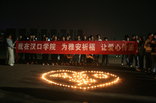 我在汉口学院,为雅安祈福,让爱心传递。4月24日晚,由我校管理学院12级财专一班和财专二班共同组织的为“雅安祈福”的活动在操场举行。