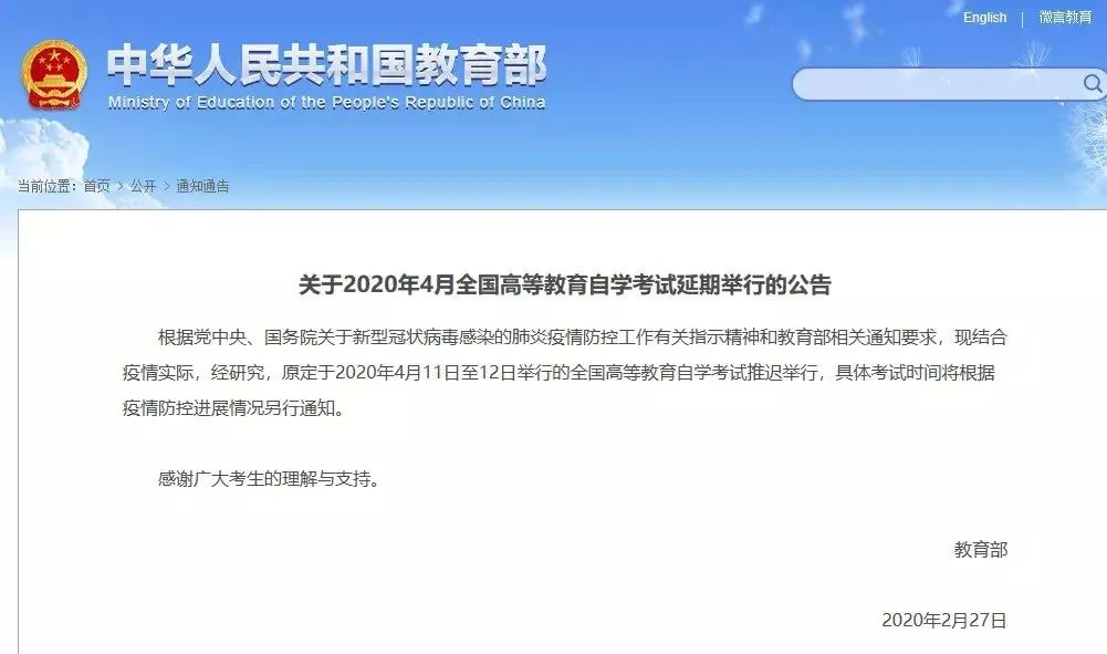 关于2020年4月全国高等教育自学考试延期举行的公告